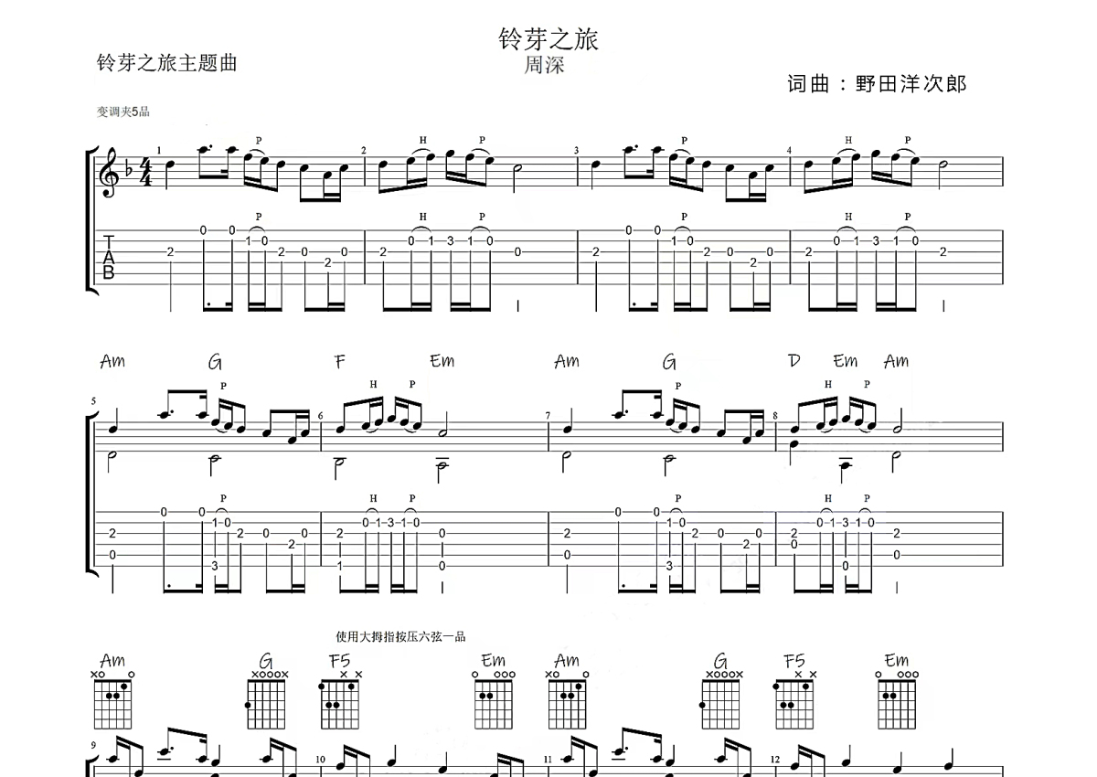 周深《铃芽之旅》吉他谱 - F调独奏六线谱
