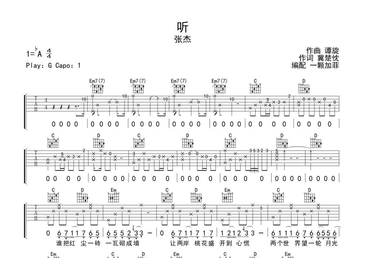 张杰《听》吉他谱 - G调弹唱六线谱