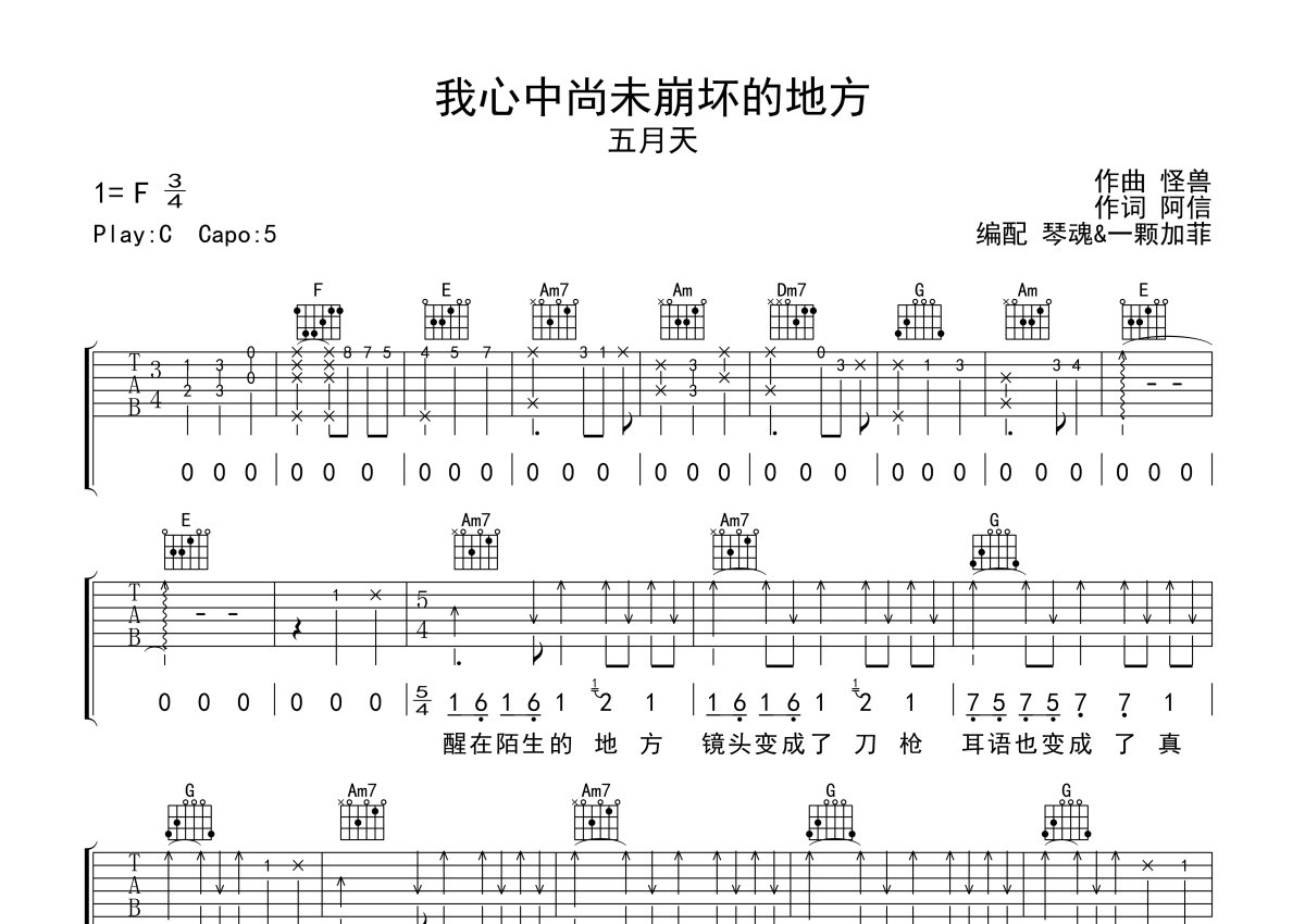 《我心中尚未崩坏的地方》是五月天演唱的一首歌曲,本吉他谱采用的是C调指法编配,这份吉他谱共有四张高清图谱,图谱由 @一颗加菲 编配上传,图谱使用六线谱编配,包含吉他和弦指法、简谱以及歌词部分,曲谱配备了相关的音频提供试听,使用这份我心中尚未崩坏的地方吉他谱,可以让你更加方便地掌握这首歌曲的弹唱技巧,快来尝试吧。