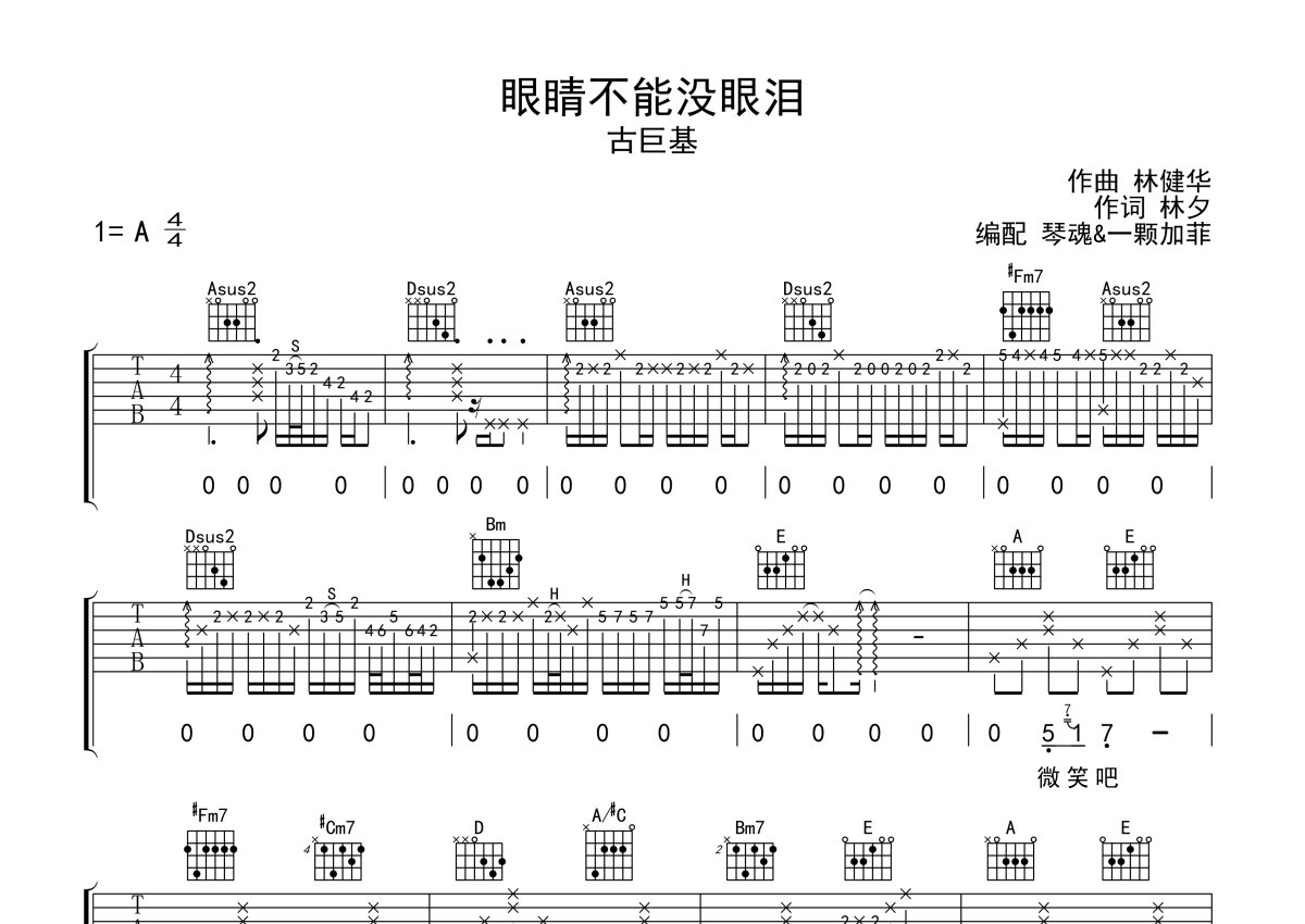 《眼睛不能没眼泪》是古巨基演唱的一首歌曲,本吉他谱采用的是A调指法编配,这份吉他谱共有三张高清图谱,图谱由 @一颗加菲 编配上传,图谱使用六线谱编配,包含吉他和弦指法、简谱以及歌词部分,曲谱配备了相关的音频提供试听,使用这份眼睛不能没眼泪吉他谱,可以让你更加方便地掌握这首歌曲的弹唱技巧,快来尝试吧。