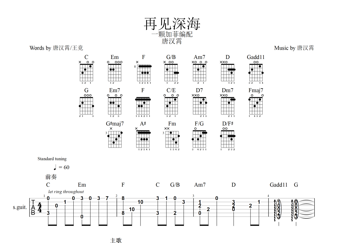 唐汉霄《再见深海》吉他谱 - C调独奏六线谱