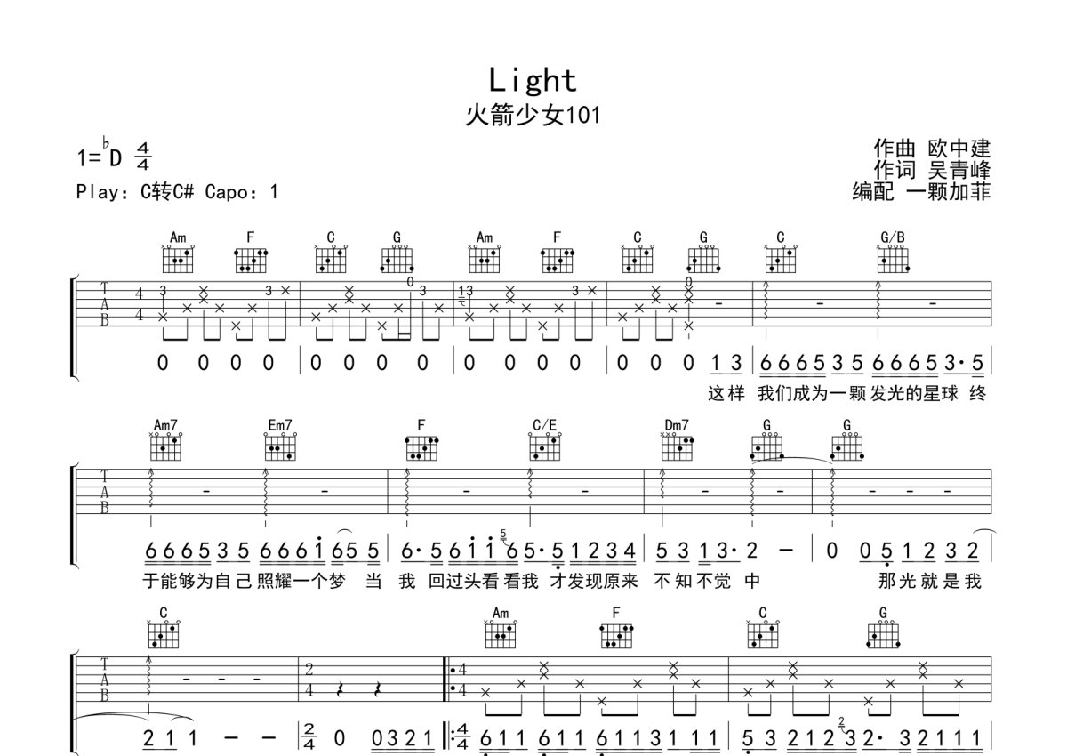 火箭少女101《Light》吉他谱 - C调弹唱六线谱