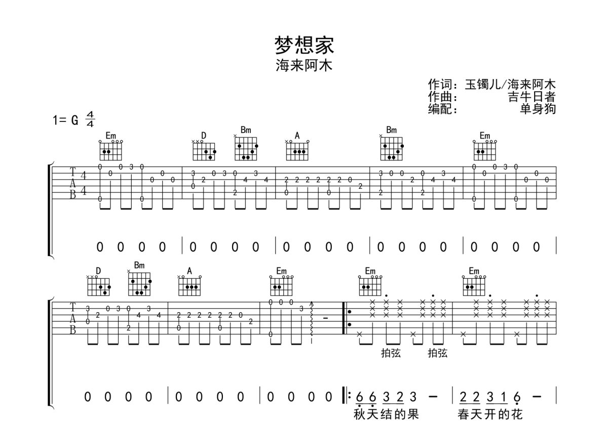 海来阿木《梦想家》吉他谱 - G调弹唱六线谱
