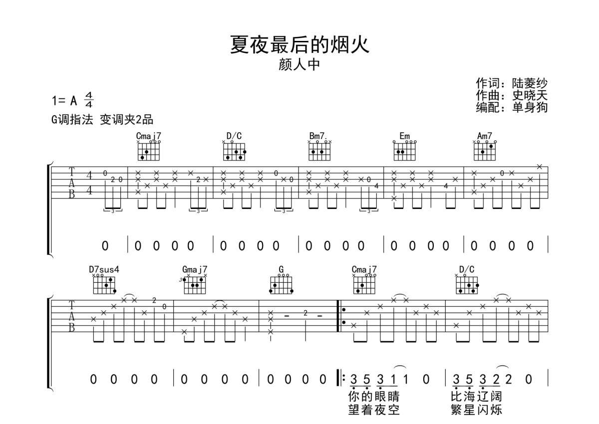 《夏夜最后的烟火》是夏夜最后的烟火演唱的一首歌曲,本吉他谱采用的是G调指法编配,这份吉他谱共有四张高清图谱,图谱由 @单身狗 编配上传,图谱使用六线谱编配,包含吉他和弦指法、简谱以及歌词部分,使用这份夏夜最后的烟火吉他谱,可以让你更加方便地掌握这首歌曲的弹唱技巧,快来尝试吧。