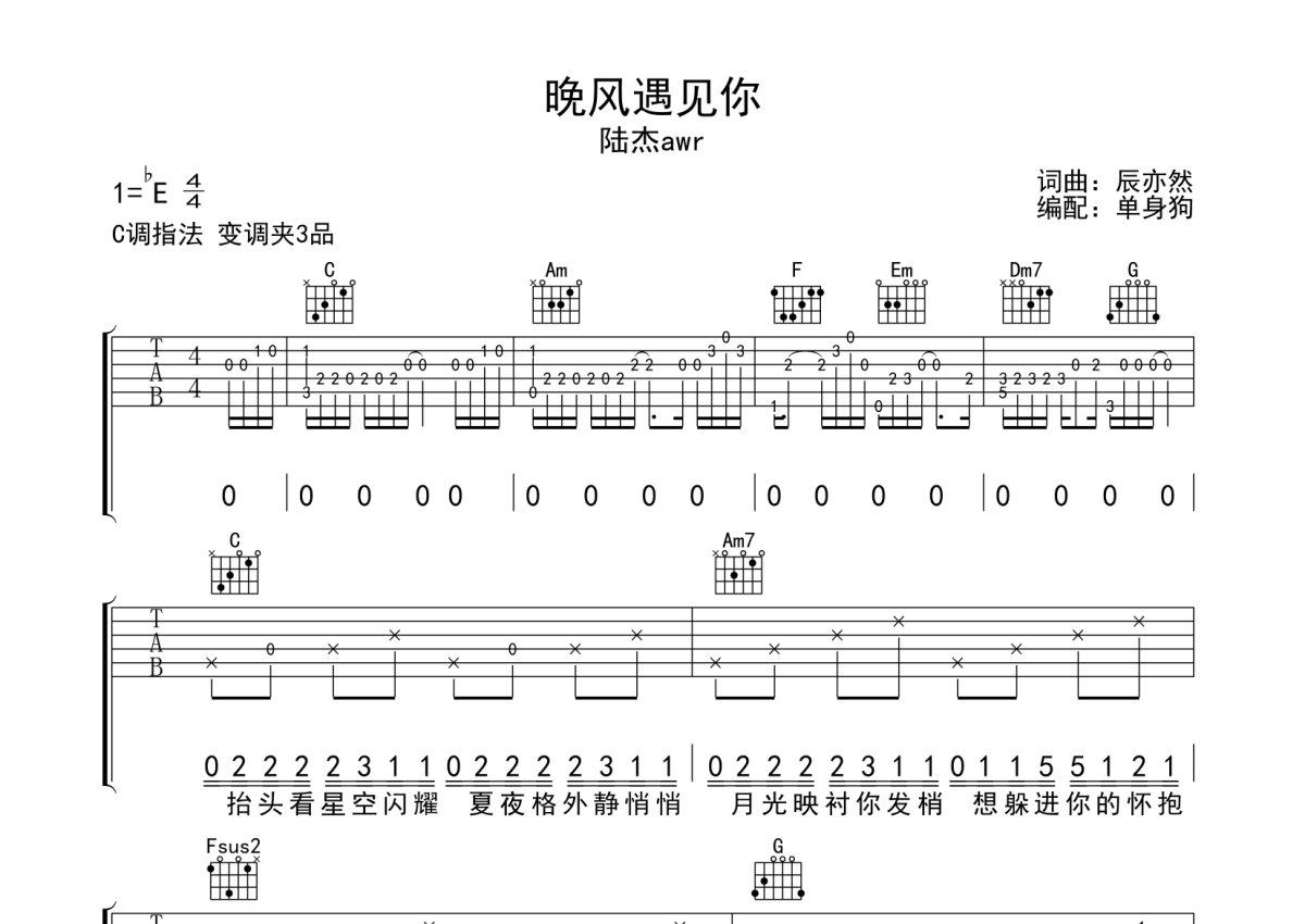 陆杰awr《晚风遇见你》吉他谱 - C调弹唱六线谱
