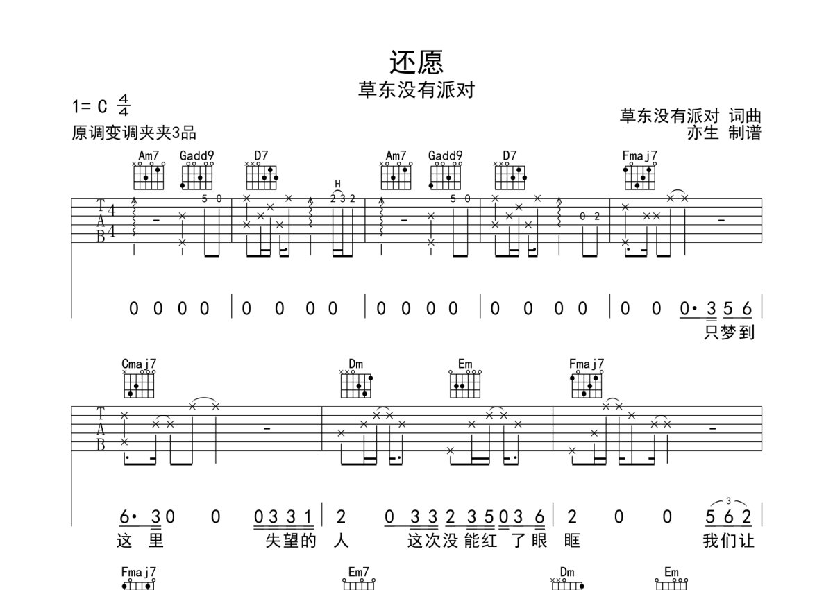 草东没有派对《还愿》吉他谱 - C调弹唱六线谱