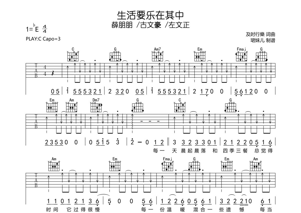 薛朋朋 /古文豪 /左文正《生活要乐在其中》吉他谱 - C调弹唱六线谱