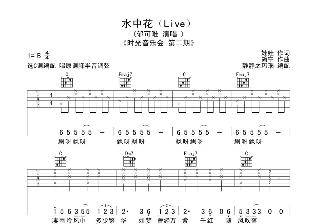 郁可唯《水中花》吉他谱 - C调弹唱六线谱