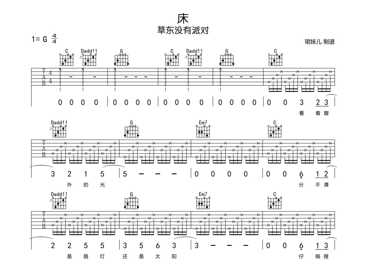 草东没有派对《床》吉他谱 - G调弹唱六线谱