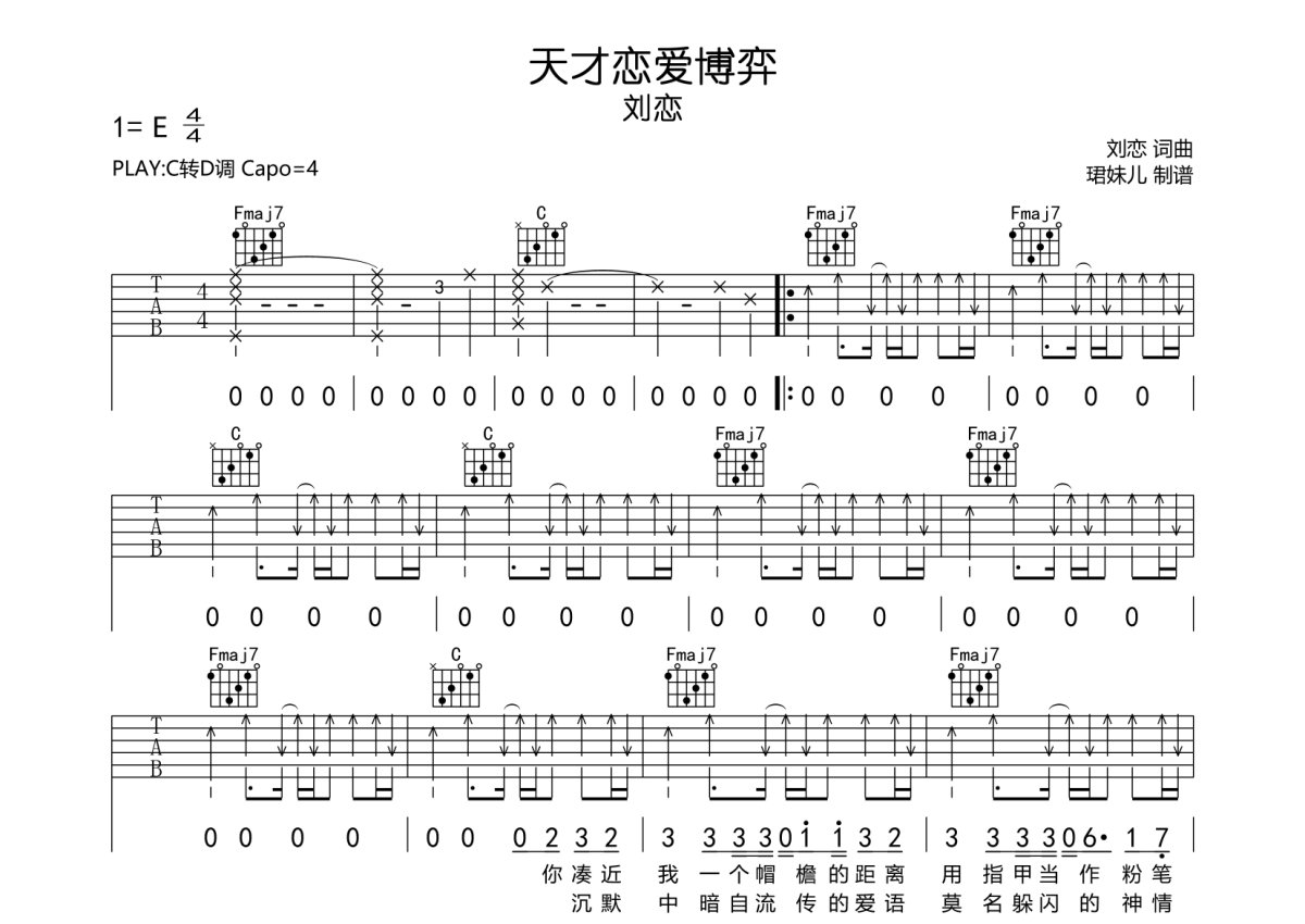 刘恋《天才恋爱博弈》吉他谱 - C调弹唱六线谱