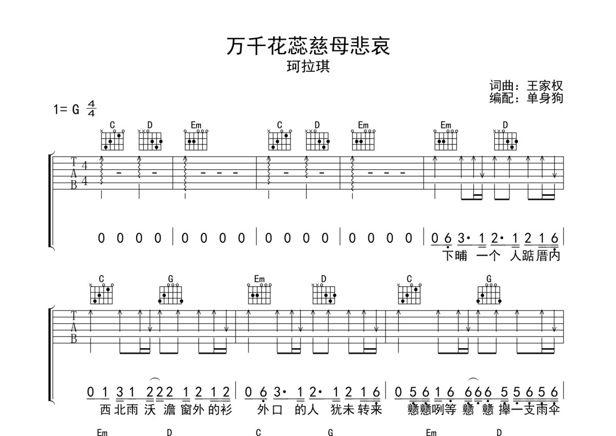珂拉琪《万千花蕊慈母悲哀》吉他谱 - G调弹唱六线谱