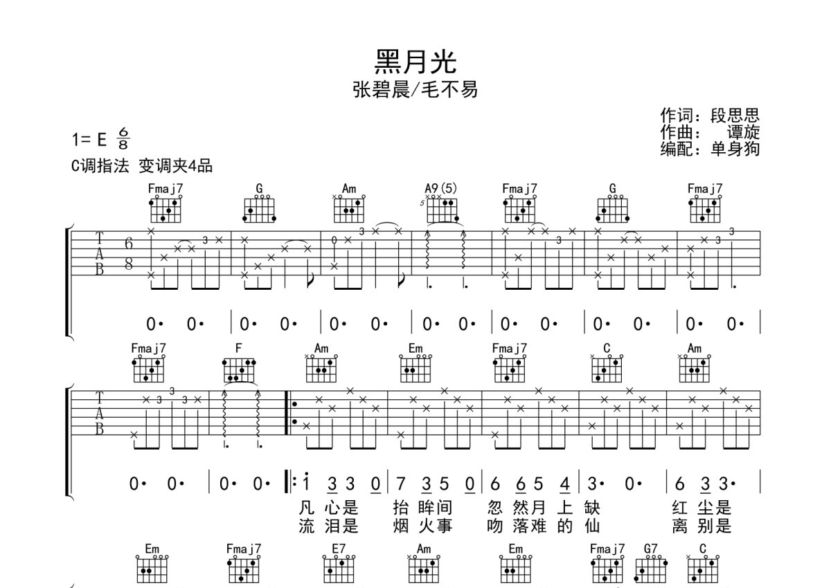张碧晨/毛不易《黑月光》吉他谱 - C调弹唱六线谱