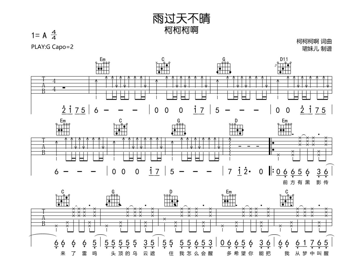 柯柯柯啊《雨过天不晴》吉他谱 - G调弹唱六线谱
