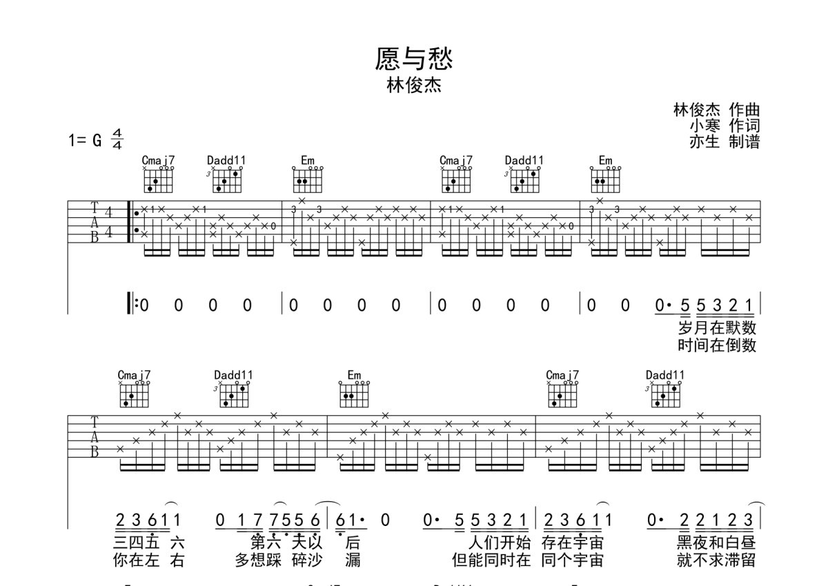 林俊杰《愿与愁》吉他谱 - G调弹唱六线谱