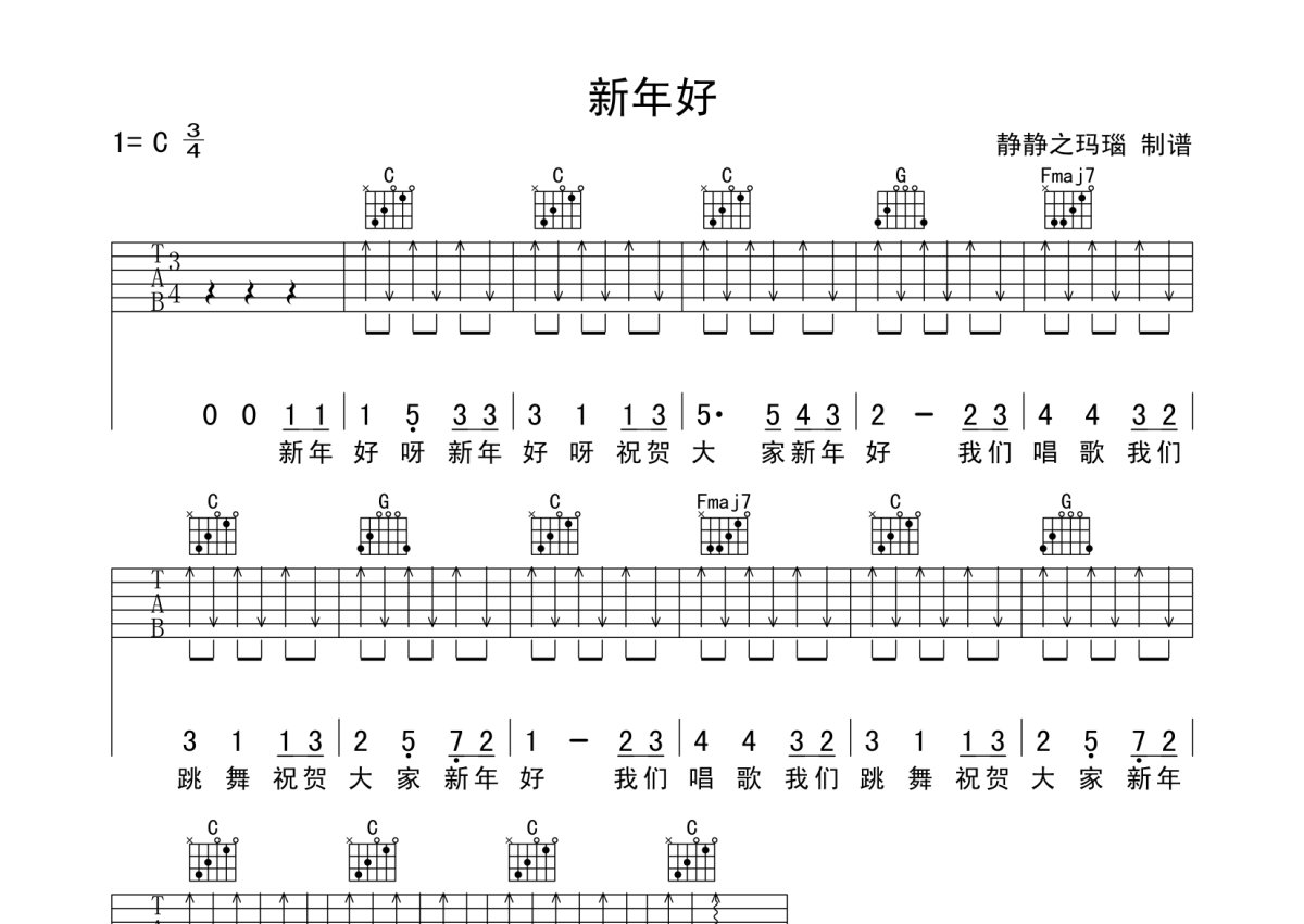儿歌《新年好》吉他谱 - C调弹唱六线谱
