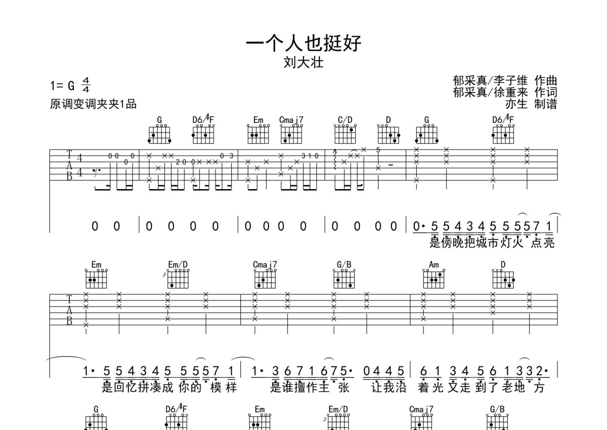 刘大壮《一个人也挺好》吉他谱 - G调弹唱六线谱