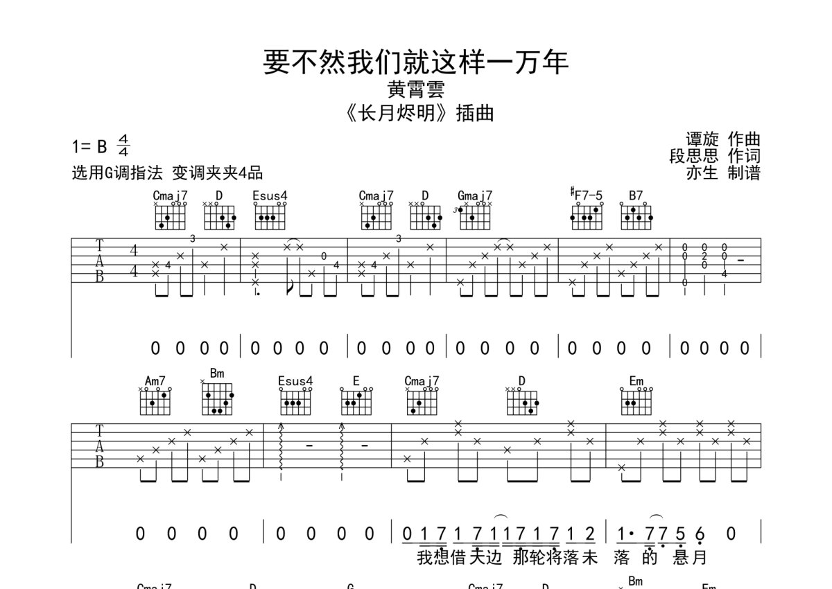 《要不然我们就这样一万年》是黄霄雲演唱的一首歌曲,本吉他谱采用的是G调指法编配,这份吉他谱共有三张高清图谱,图谱由 @亦生 编配上传,图谱使用六线谱编配,包含吉他和弦指法、简谱以及歌词部分,使用这份要不然我们就这样一万年吉他谱,可以让你更加方便地掌握这首歌曲的弹唱技巧,快来尝试吧。要不然我们就这样一万年吉他弹唱谱,本吉他谱采用G调和弦编配,演奏建议变调夹夹第4品,演奏速度大概90拍每分钟,难度简单。