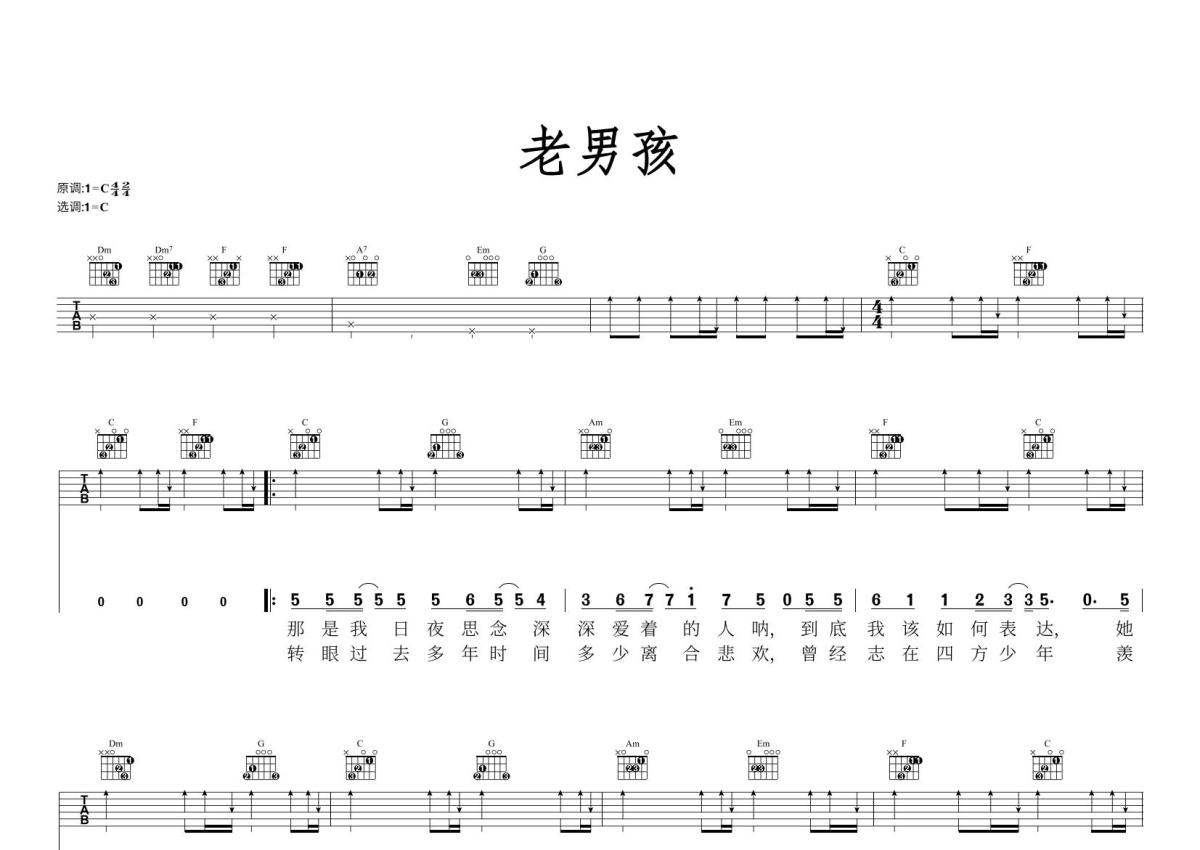筷子兄弟《老男孩》吉他谱 - C调弹唱六线谱