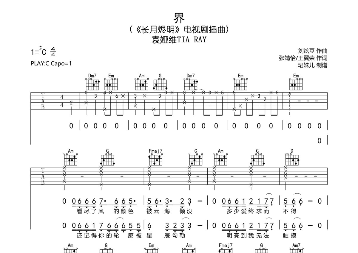 《界》是袁娅维TIA RAY演唱的一首歌曲,本吉他谱采用的是C调指法编配,这份吉他谱共有三张高清图谱,图谱由 @珺妹儿 编配上传,图谱使用六线谱编配,包含吉他和弦指法、简谱以及歌词部分,使用这份界吉他谱,可以让你更加方便地掌握这首歌曲的弹唱技巧,快来尝试吧。用C调指法编,,弹唱建议变调夹1品,速度65难度较简单,易上手。