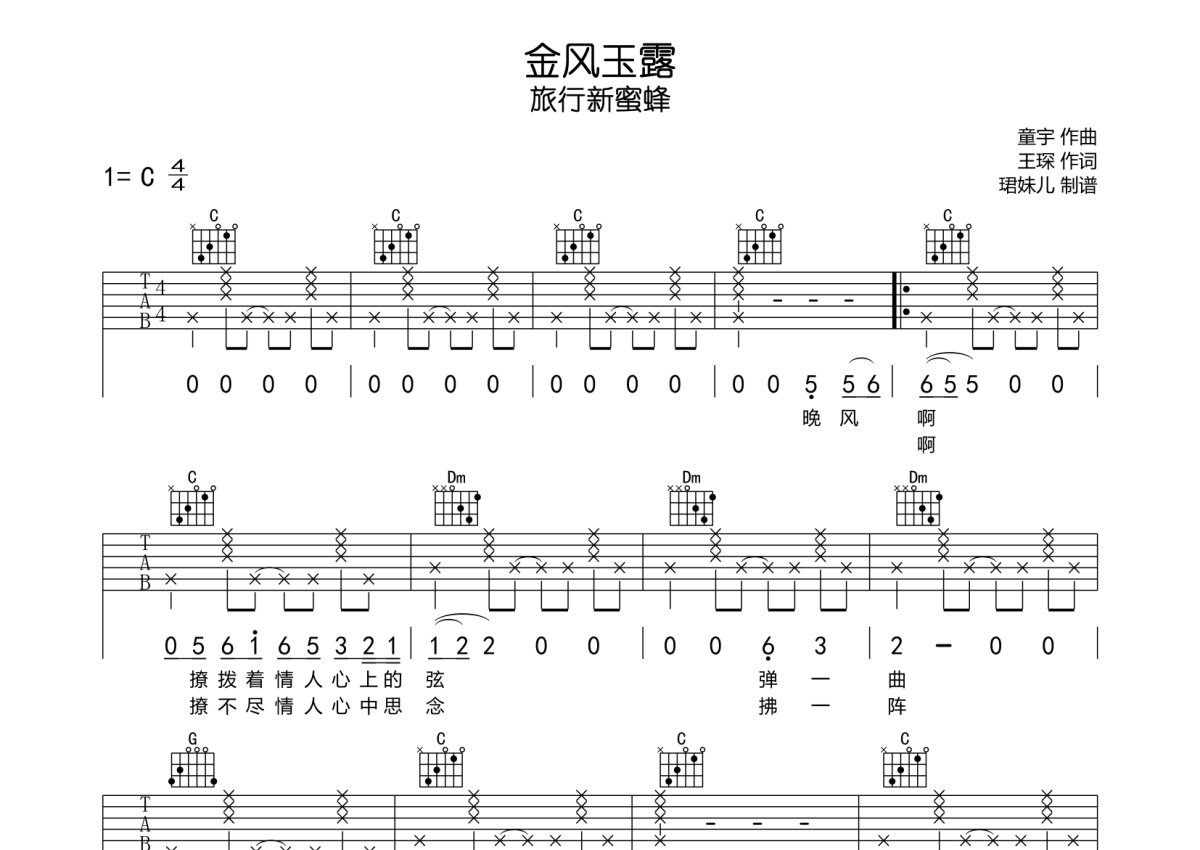 旅行新蜜蜂《金风玉露》吉他谱 - C调弹唱六线谱