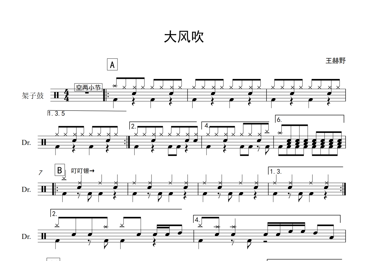《大风吹》是王赫野演唱的一首歌曲,这份鼓谱共有一张高清图谱,图谱由 @打鼓谱 编配上传,图谱使用五线谱编配,使用这份大风吹架子鼓谱,你将能够轻松地敲打出这首王赫野的大风吹,快来尝试吧。简易版 学员外出演出版。