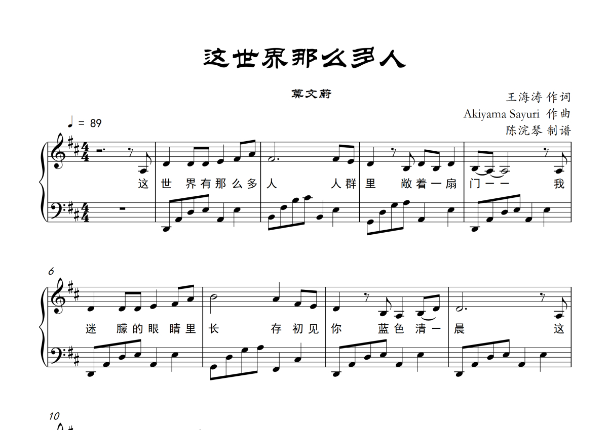 《这世界那么多人》是莫文蔚演唱的一首歌曲,这份钢琴谱共有两张高清图谱,图谱由 @月隐云先知 编配上传,曲谱配备了相关的音频提供试听,使用这份这世界那么多人钢琴谱,可以让你更加方便地掌握这首歌曲的演奏技巧,快来尝试吧。音频仅录制部分。