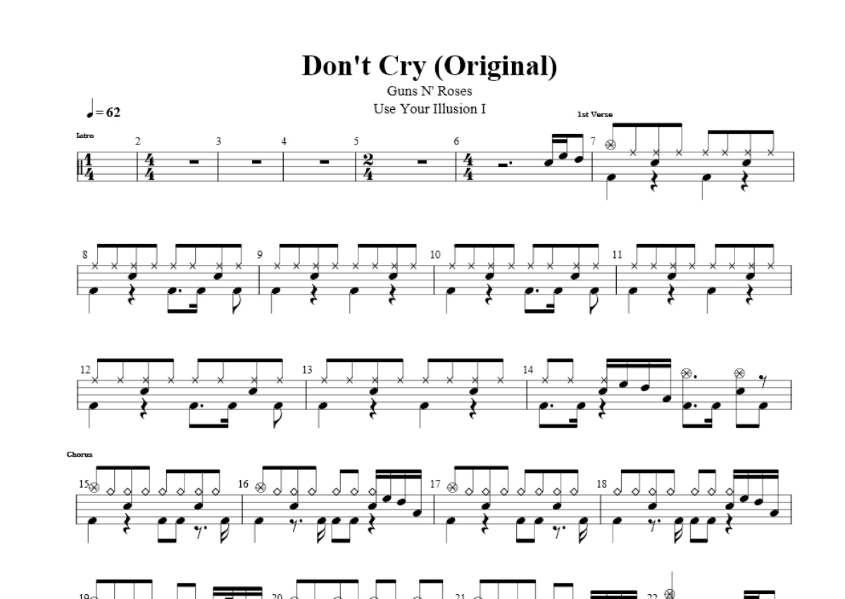 《Don't Cry》是枪炮与玫瑰乐队演唱的一首歌曲,这份鼓谱共有两张高清图谱,图谱由 @打鼓谱 编配上传,图谱使用五线谱编配,使用这份Don't Cry架子鼓谱,你将能够轻松地敲打出这首枪炮与玫瑰乐队的Don't Cry,快来尝试吧。原始版(Original) 1985年,枪炮与玫瑰乐队刚组建不久便创作了《Don't Cry》,并于同年秋在洛杉矶录制了DEMO小样 [2] 。鼓手Steven Adler编写了简单却动人的鼓点部分 [3] 。《Don't Cry》是艾克索·罗斯为乐队写的第一首歌曲。艾斯·斯塔德林曾和一个女孩交往,艾克索·罗斯也喜欢这个女孩。他们分手后,艾克索·罗斯意识到自己爱上了这个女孩,但她觉得和艾克索·罗斯之间没有可能。她准备和艾克索·罗斯道别时,艾克索·罗斯开始哭泣,这时女孩说道:“别哭。”(Don't Cr。