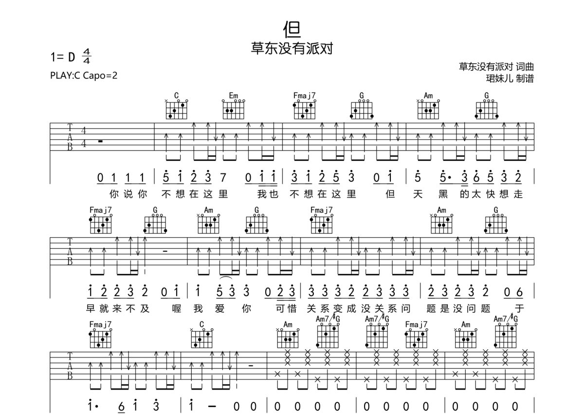 《但》是草东没有派对演唱的一首歌曲,本吉他谱采用的是C调指法编配,这份吉他谱共有两张高清图谱,图谱由 @珺妹儿 编配上传,图谱使用六线谱编配,包含吉他和弦指法、简谱以及歌词部分,使用这份但吉他谱,可以让你更加方便地掌握这首歌曲的弹唱技巧,快来尝试吧。用C调指法编,,弹唱建议变调夹2品,速度95难度较简单,易上手。