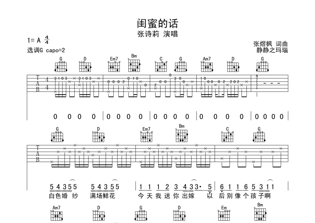 张诗莉《闺蜜的话》吉他谱 - G调弹唱六线谱