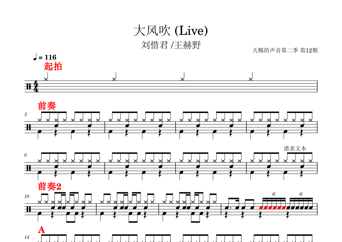 刘惜君 /王赫野《大风吹》鼓谱 - 架子鼓谱
