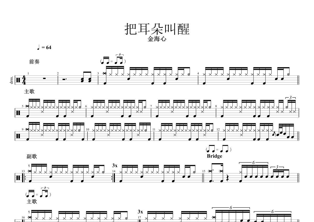 金海心《把耳朵叫醒》鼓谱 - 架子鼓谱