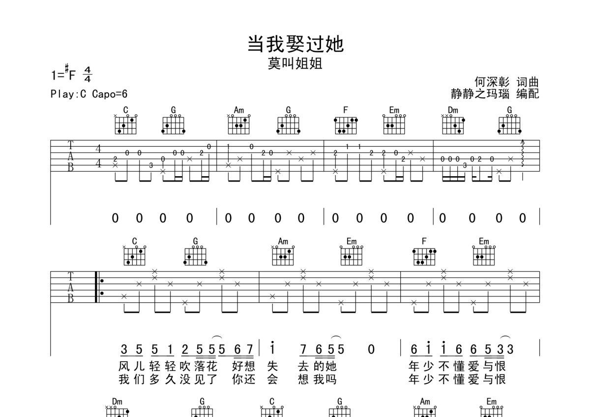莫叫姐姐《当我娶过她》吉他谱 - C调弹唱六线谱