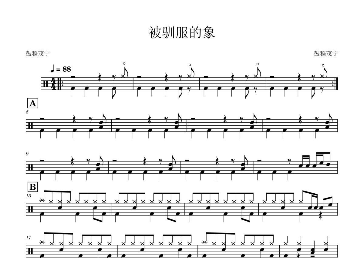 《被驯服的象》是蔡健雅演唱的一首歌曲,这份鼓谱共有两张高清图谱,图谱由 @打鼓谱 编配上传,图谱使用五线谱编配,使用这份被驯服的象架子鼓谱,你将能够轻松地敲打出这首蔡健雅的被驯服的象,快来尝试吧。加入了一些简单的solo 适合初级 好听。