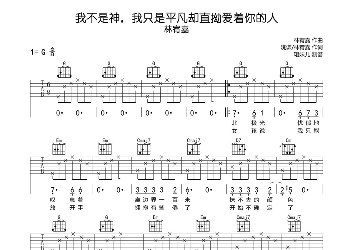 《我不是神,我只是平凡却直拗爱着你的人》是林宥嘉演唱的一首歌曲,本吉他谱采用的是G调指法编配,这份吉他谱共有三张高清图谱,图谱由 @珺妹儿 编配上传,图谱使用六线谱编配,包含吉他和弦指法、简谱以及歌词部分,使用这份我不是神,我只是平凡却直拗爱着你的人吉他谱,可以让你更加方便地掌握这首歌曲的弹唱技巧,快来尝试吧。用G调指法编,速度85难度较简单,易上手。