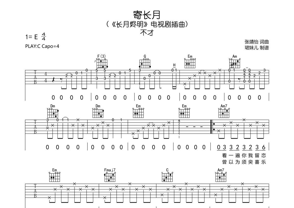《寄长月》是不才演唱的一首歌曲,本吉他谱采用的是C调指法编配,这份吉他谱共有三张高清图谱,图谱由 @珺妹儿 编配上传,图谱使用六线谱编配,包含吉他和弦指法、简谱以及歌词部分,使用这份寄长月吉他谱,可以让你更加方便地掌握这首歌曲的弹唱技巧,快来尝试吧。用C调指法编,,弹唱建议变调夹4品,速度95难度较简单,易上手。