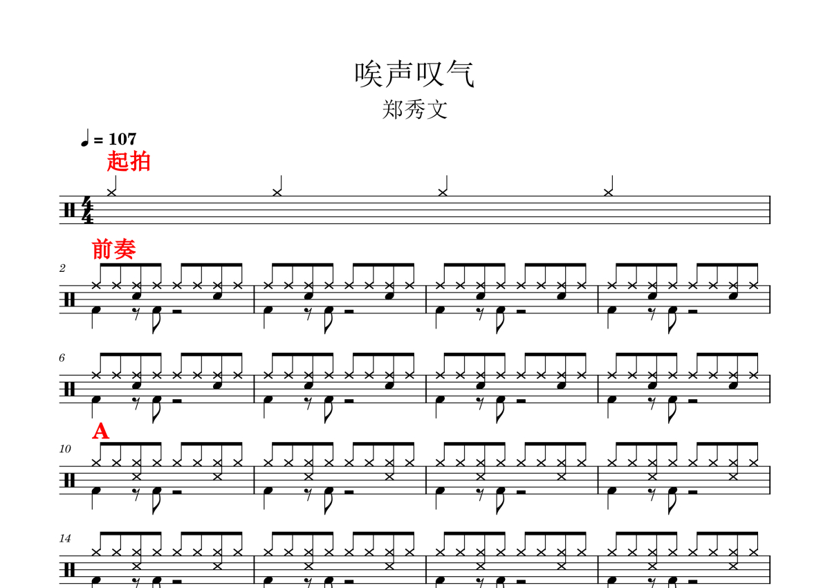 《唉声叹气》是郑秀文演唱的一首歌曲,这份鼓谱共有三张高清图谱,图谱由 @打鼓谱 编配上传,图谱使用五线谱编配,使用这份唉声叹气架子鼓谱,你将能够轻松地敲打出这首郑秀文的唉声叹气,快来尝试吧。适合现场鼓手看段落的简谱。