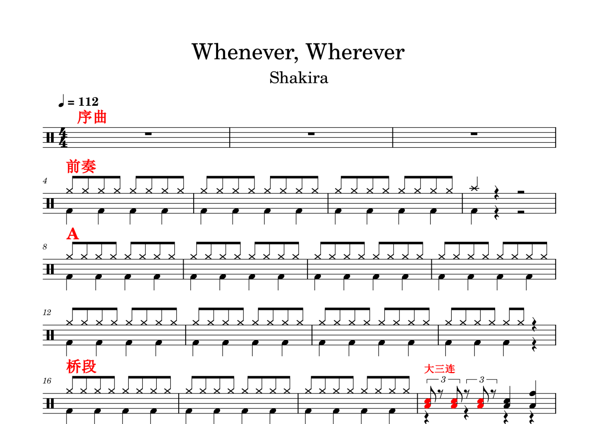 Shakira《Whenever Wherever》鼓谱 - 架子鼓谱
