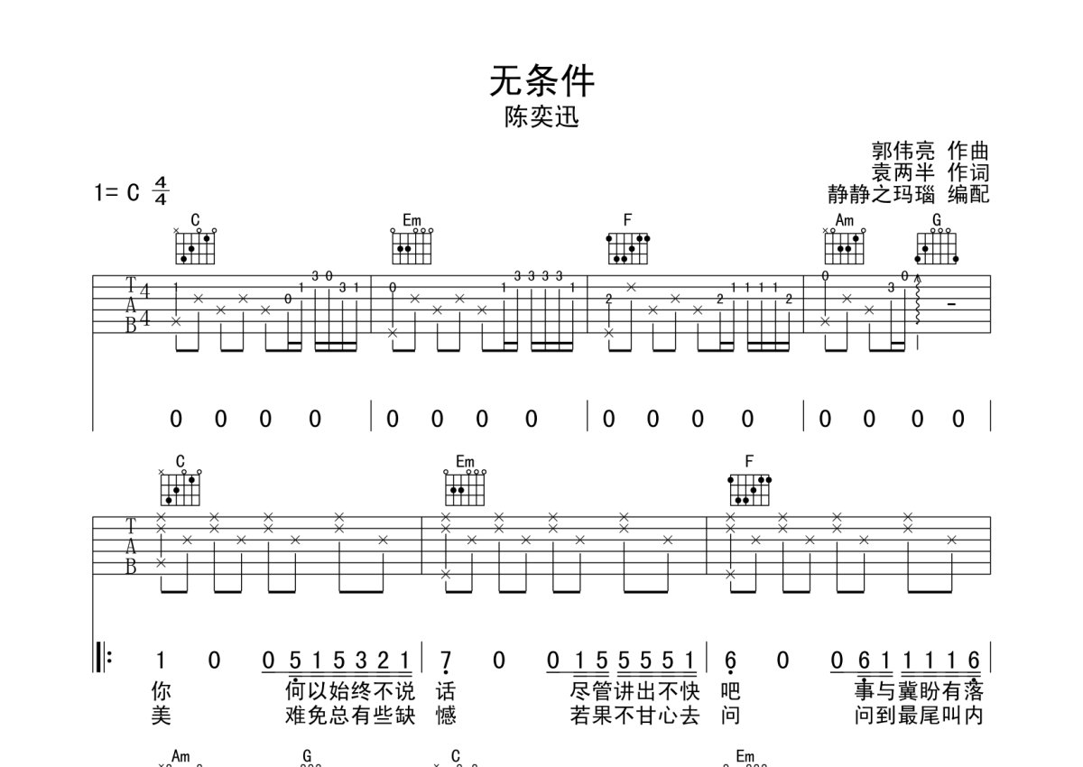 陈奕迅《无条件》吉他谱 - C调弹唱六线谱