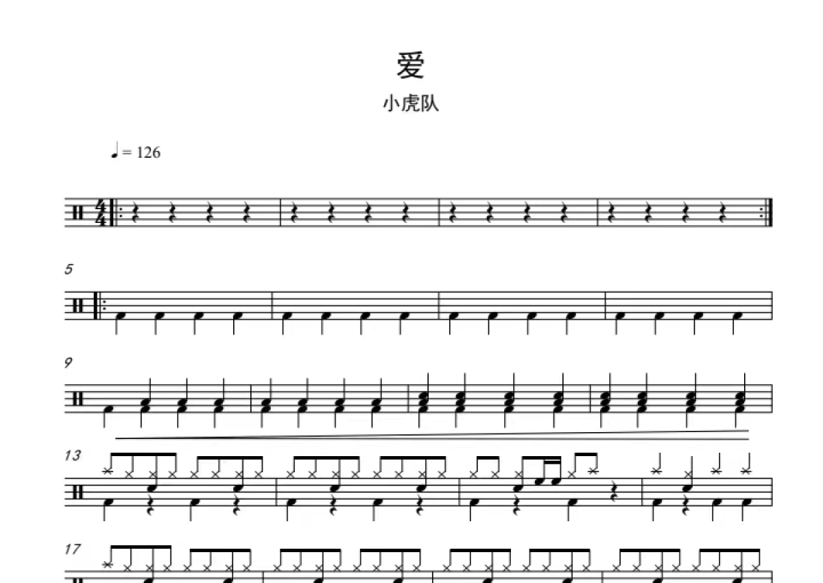 《爱》是小虎队演唱的一首歌曲,这份鼓谱共有三张高清图谱,图谱由 @打鼓谱 编配上传,图谱使用五线谱编配,使用这份爱架子鼓谱,你将能够轻松地敲打出这首小虎队的爱,快来尝试吧。(爱)小虎队。