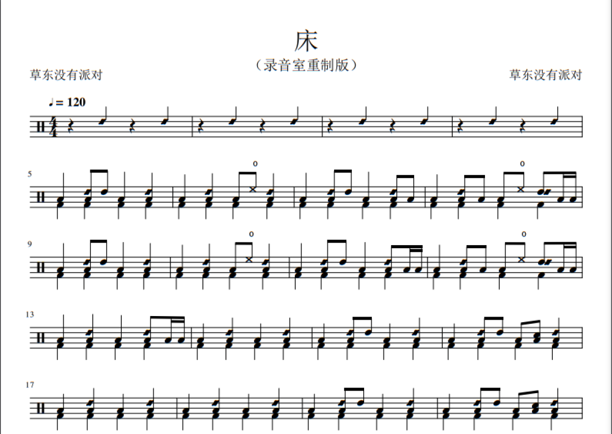 《床》是草东没有派对演唱的一首歌曲,录音室重制版,这份鼓谱共有三张高清图谱,图谱由 @打鼓谱 编配上传,图谱使用五线谱编配,使用这份床架子鼓谱,你将能够轻松地敲打出这首草东没有派对的床,快来尝试吧。草东没有派对(No Party For Cao Dong),原名草东街派对,中国台湾摇滚乐团,由主唱兼吉他手巫堵、吉他手筑筑、贝斯手世暄、鼓手蔡忆凡组成。2021年10月30日乐团鼓手凡凡(蔡忆凡)骤逝引伤痛。最近乐团宣布发行第二张专辑,2023年4月7日无预警发出《床》重制版,以此致敬我们最可爱的凡凡! 这份鼓谱比较接近原版,想要挑战一下的鼓友可以试一下,比较考验手脚配合,需要一定的技术。
