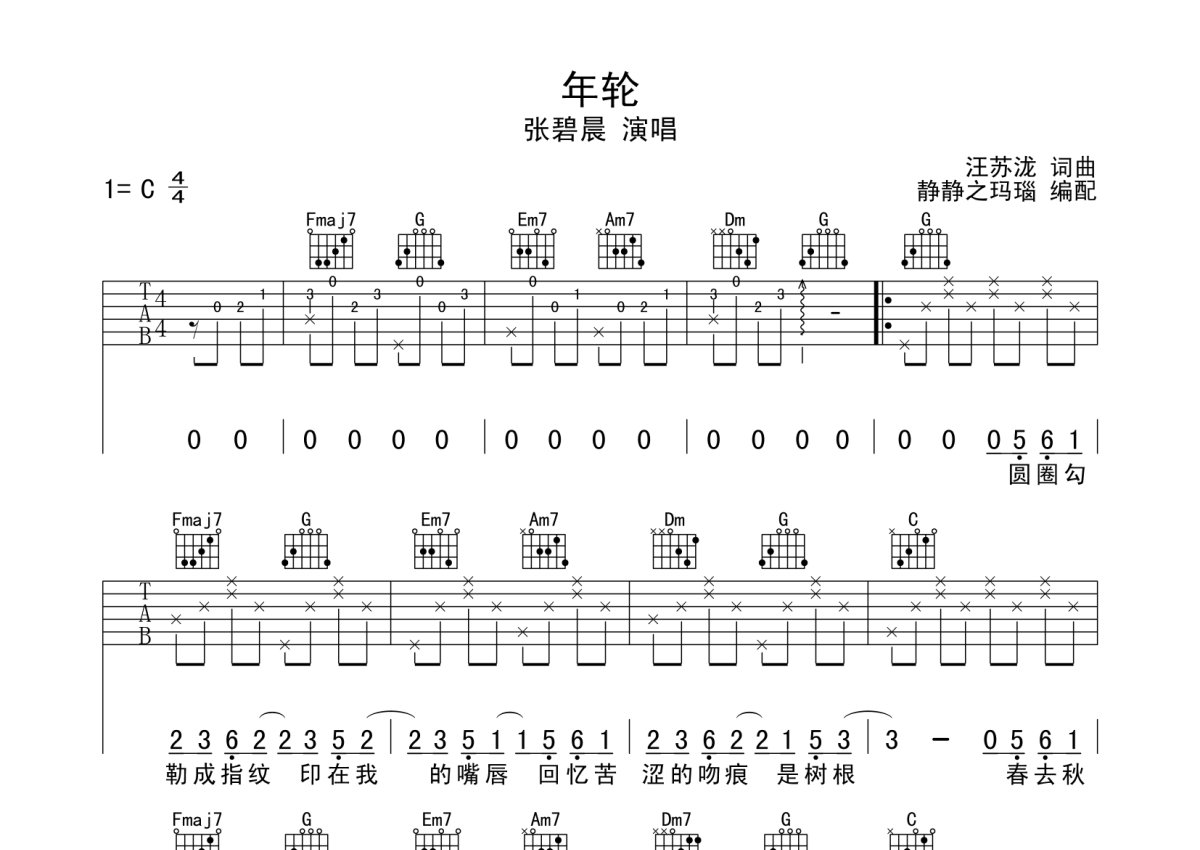张碧晨《年轮》吉他谱 - C调弹唱六线谱
