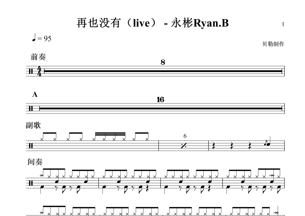 永彬Ryan.B《再也没有》鼓谱 - 架子鼓谱