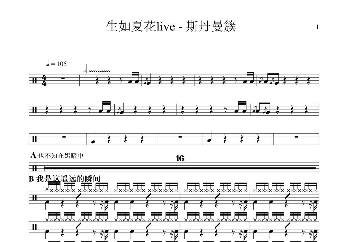 斯丹曼簇《生如夏花》鼓谱 - 架子鼓谱 - live