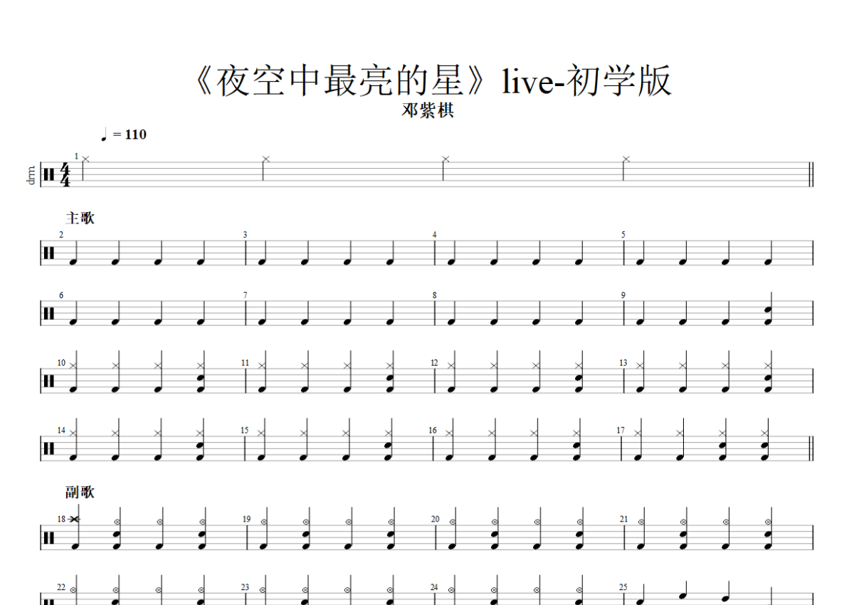 邓紫棋《夜空中最亮的星》鼓谱 - 架子鼓谱 - live初学版