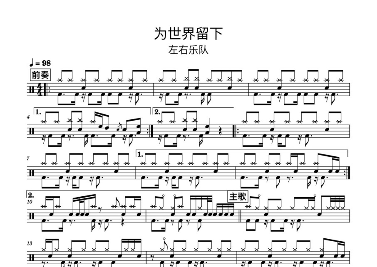 左右乐队《为世界留下》鼓谱 - 架子鼓谱