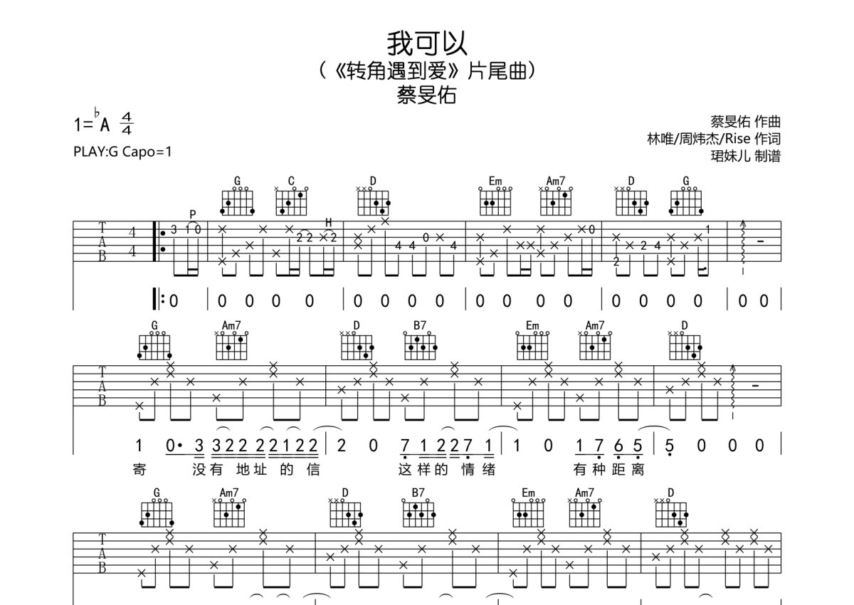 蔡旻佑《我可以》吉他谱 - G调弹唱六线谱