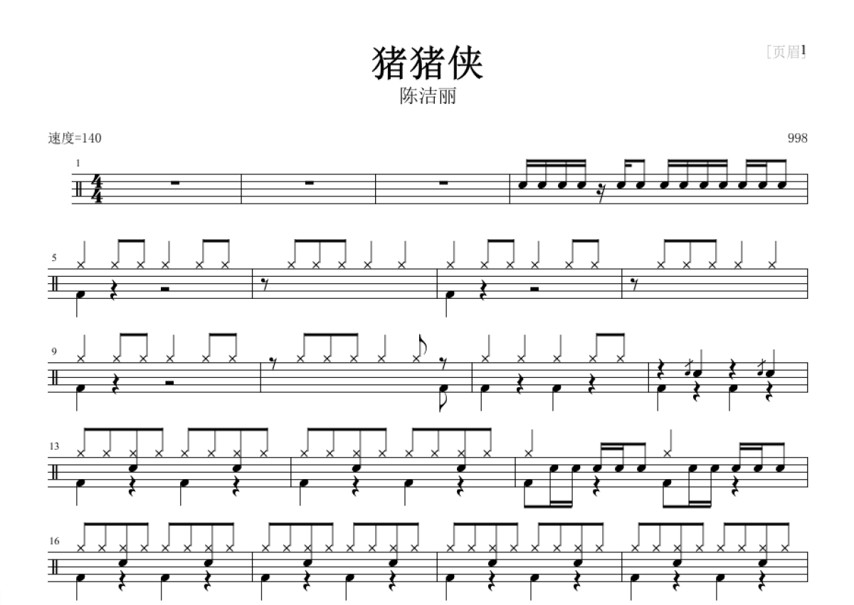 陈洁丽《猪猪侠》鼓谱 - 架子鼓谱