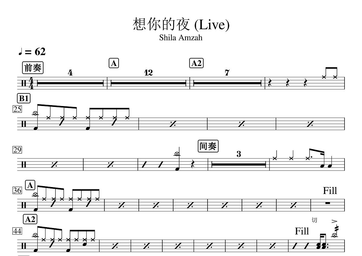 Shila Amzah《想你的夜》鼓谱 - 架子鼓谱