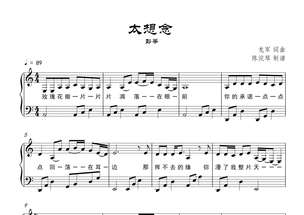 《太想念》是彭筝演唱的一首歌曲,带歌词,这份钢琴谱共有两张高清图谱,图谱由 @月隐云先知 编配上传,曲谱配备了相关的音频提供试听,使用这份太想念钢琴谱,可以让你更加方便地掌握这首歌曲的演奏技巧,快来尝试吧。
