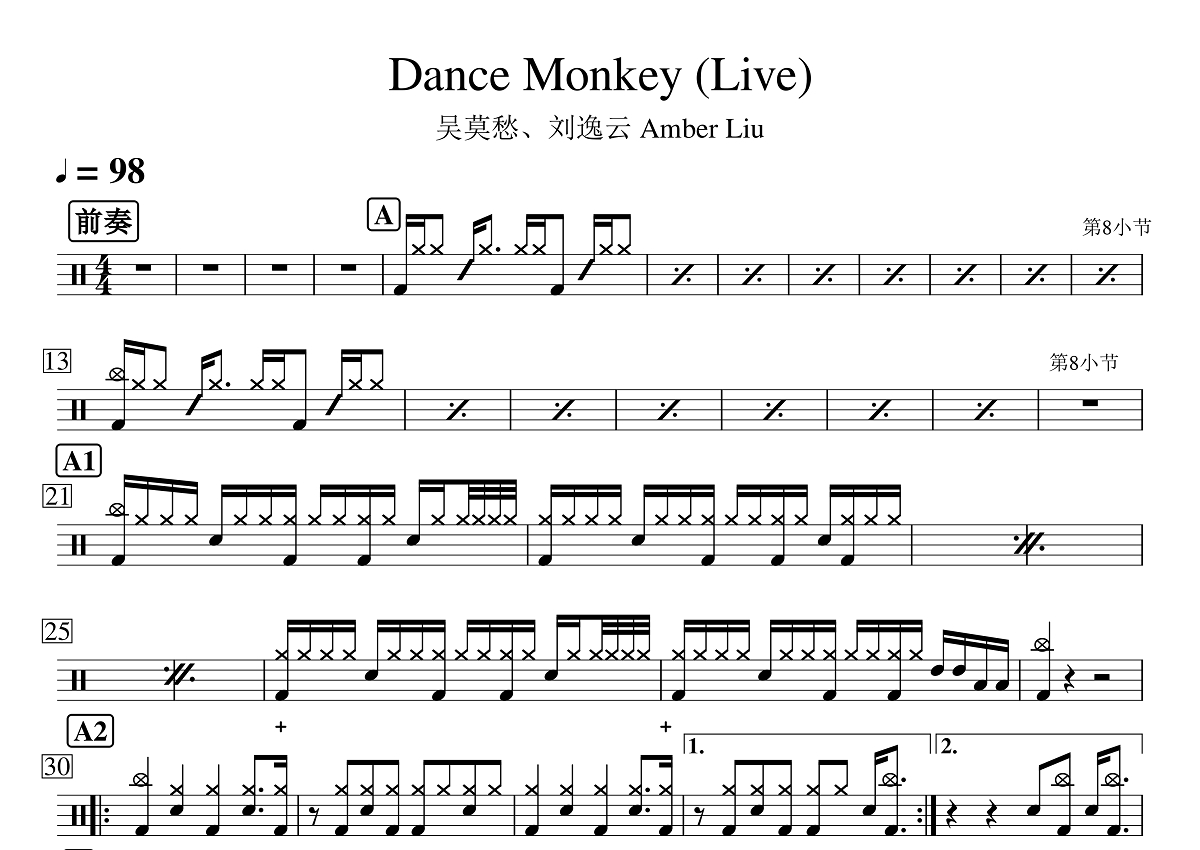 吴莫愁/刘逸云/Amber Liu《Dance Monkey》鼓谱 - 架子鼓谱 - Live